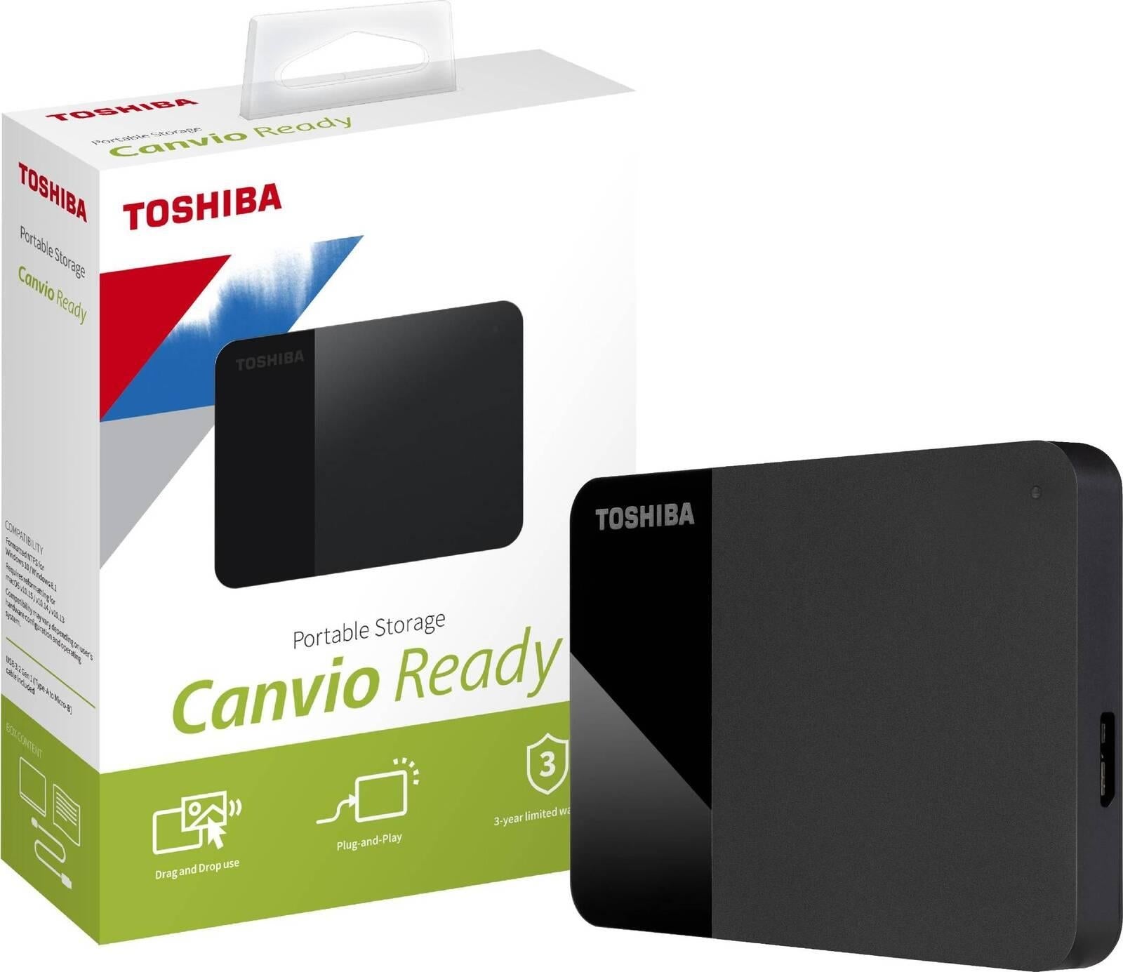 The Toshiba Canvio Ready Hard Drive is a simple data storage solution that offers plug & play operation. It has 1 TB storage capacity to let you collect and store your favourite content with ease. This hard drive has a compact design with a unique, two-tone finish for style.*Features:** This hard drive is a simple data storage solution, allowing you to save files like photos, videos, and documents with ease.* It has a capacity of 1TB.* It boasts a SuperSpeed USB 3.2 (Gen 1) port.* It comes with a USB 3.2 Gen 1 Cable (Type-A to Micro-B), as well as a User's Manual that is pre-installed on the hard drive.* The hard drive has a stylish, two-tone matte and gloss finish that is also compact and easy to carry.* It comes with plug & play operation plus drag-and-drop use.* It is compatible with Windows 7 and higher operating systems.* There is a 3 year warranty included.* It comes in black.*System Requirements*Formatted NTFS for Microsoft® Windows® 11, Microsoft® Windows® 10, Windows® 8.1. One free USB 3.2 Gen 1 or USB 2.0 port. Requires reformatting for macOS v10.15/v10.14/v10.13*Technical Specifications** *Digital Storage Capacity:* 1 TB* *Hard Disk Interface:* USB 3.0* *Connectivity Technology:* USB* *Brand:* TOSHIBA* *Special Feature:* Portable* *Hard Disk Form Factor:* 2.5 Inches* *Hard Disk Description:* Mechanical Hard Disk* *Compatible Devices:* Desktop, Laptop* *Installation Type:* External Hard Drive* *Colour:* Black