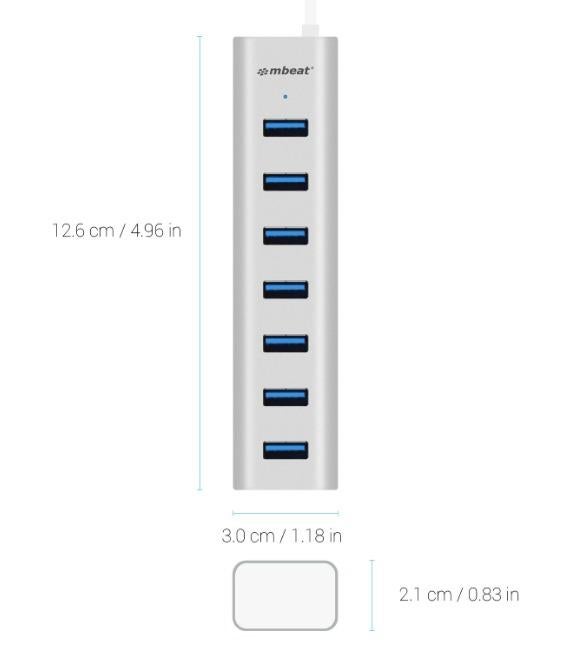 *mbeat: 7-Port USB 3.0 Aluminium Slim Hub with Power for PC and MAC*The mbeat® 7-Port USB 3.0 Aluminium Slim Hub gives you additional 7 USB 3.0 ports to a computer from a single USB 3.0 host connection. The hub is designed in aluminium housing, making it light and portable, at the same time, giving it a sleek and elegant look to suit with home and office use.The hub offers data transfer rates up to 5 Gbps and the USB hub meets SuperSpeed USB 3.0 specifications and is backward compatible with USB 2.0 and 1.1 devices.The hub also provides easy port access when connecting or disconnecting devices, it is featured in one-sided port orientation, with current overload detection and protection across all 7 ports.The hub supports Plug and Play technologies, letting you switch and operate your connected devices without having any needs for additional drivers.The USB hub is bus powered for use in environments where a power outlet may be unavailable, but is perfect for high-power USB devices when used with the included optional power adapter.*Features** Built-in with sleek, durable and elegant aluminium exterior* Comes with 7 USB 3.0 ports and delivers transfer rates up to 5 Gbps* Backward compatible with USB 2.0 and 1.1 devices* Included with independent power adaptor to provide sufficient output to connected devices\*\** Support over current and instant current protection for connected devices and hub itself*Please Note:* _Extra power adaptor is included to provide high power output to connecting devices with high demand input requirement. It is recommended to disconnect some of the idle devices._*Specifications:** Input: DC 5V, 3A* Interface: USB 3.0 Type A* Operating Environment:* Working: ?0 – 50 Celcius* Storage: –20 – 60 Celsius* Installation: Plug and Play* Product Dimension: 30 × 126 × 21 mm* Product Weight: 82g
