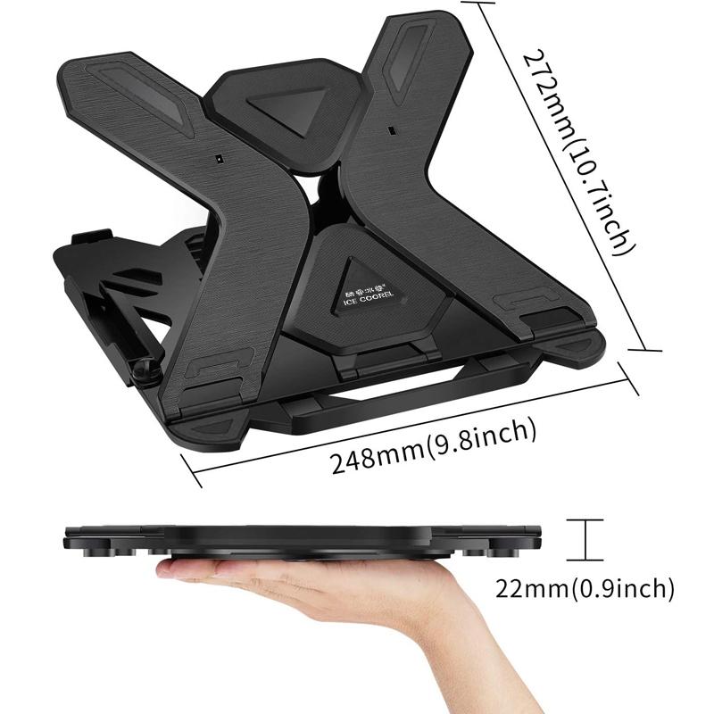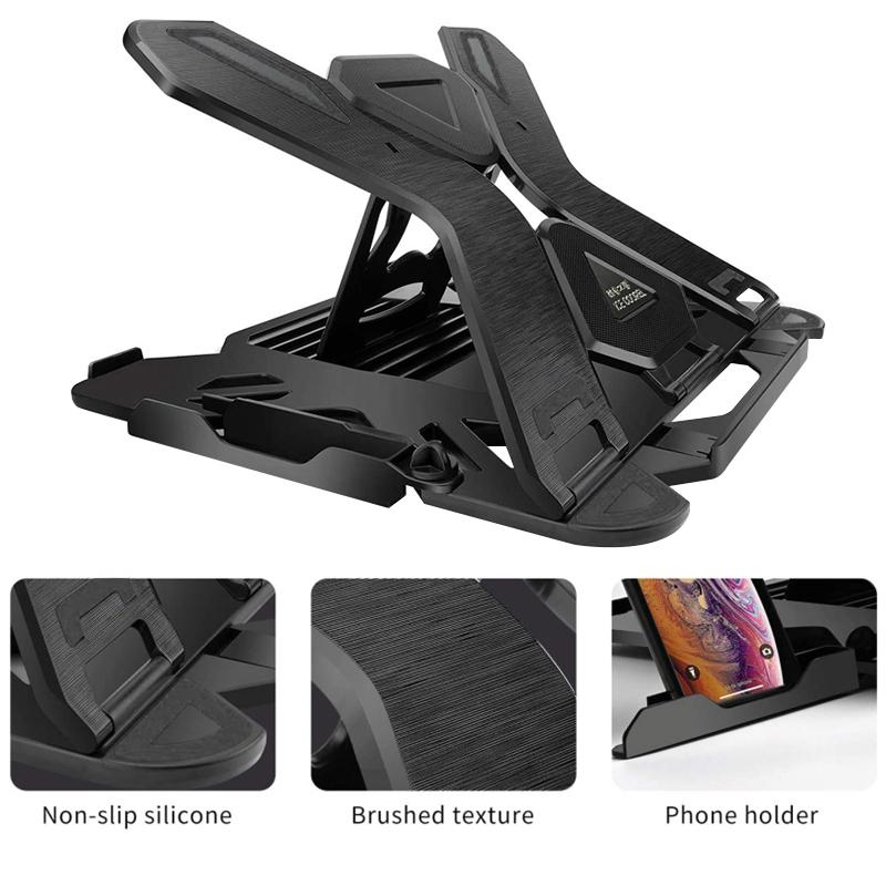 Improve your posture and reduce back pain with our multi-angle adjustable laptop stand. This stand allows you to adjust your laptop's height to one of eight different levels (ranging from 12.5cm to 17.5cm), enhancing your work efficiency.Crafted from lightweight ABS Plastic material. Its non-slip rubber surface pads keep your laptop securely in place, while the stand itself maintains its colour without fading over time.Designed for laptops up to 17 inches, our stand can support a maximum load of 20kg, ensuring durability and stability. The turntable feature on the bottom allows for easy rotation, making it convenient to share your computer screen with others.Additionally, the stand includes a foldable phone holder on the side, providing a convenient placement and viewing solution for your phone. It even features a cut-out design to prevent your device from overheating.*Package Content:** 1 x Laptop Stand* 1 x User Manual*_Note Product may vary in colour_**Technical Specifications** *_Colour:_* Black* *_Material:_* Lightweight ABS Plastic* *_Size:_* 28×28×2.5cm* *_Weight:_* 620 grams* *_Height Adjustment:_* 8 levels* *_Maximum Load Capacity:_* 20kg* *_Compatibility:_* Laptops up to 17 inches