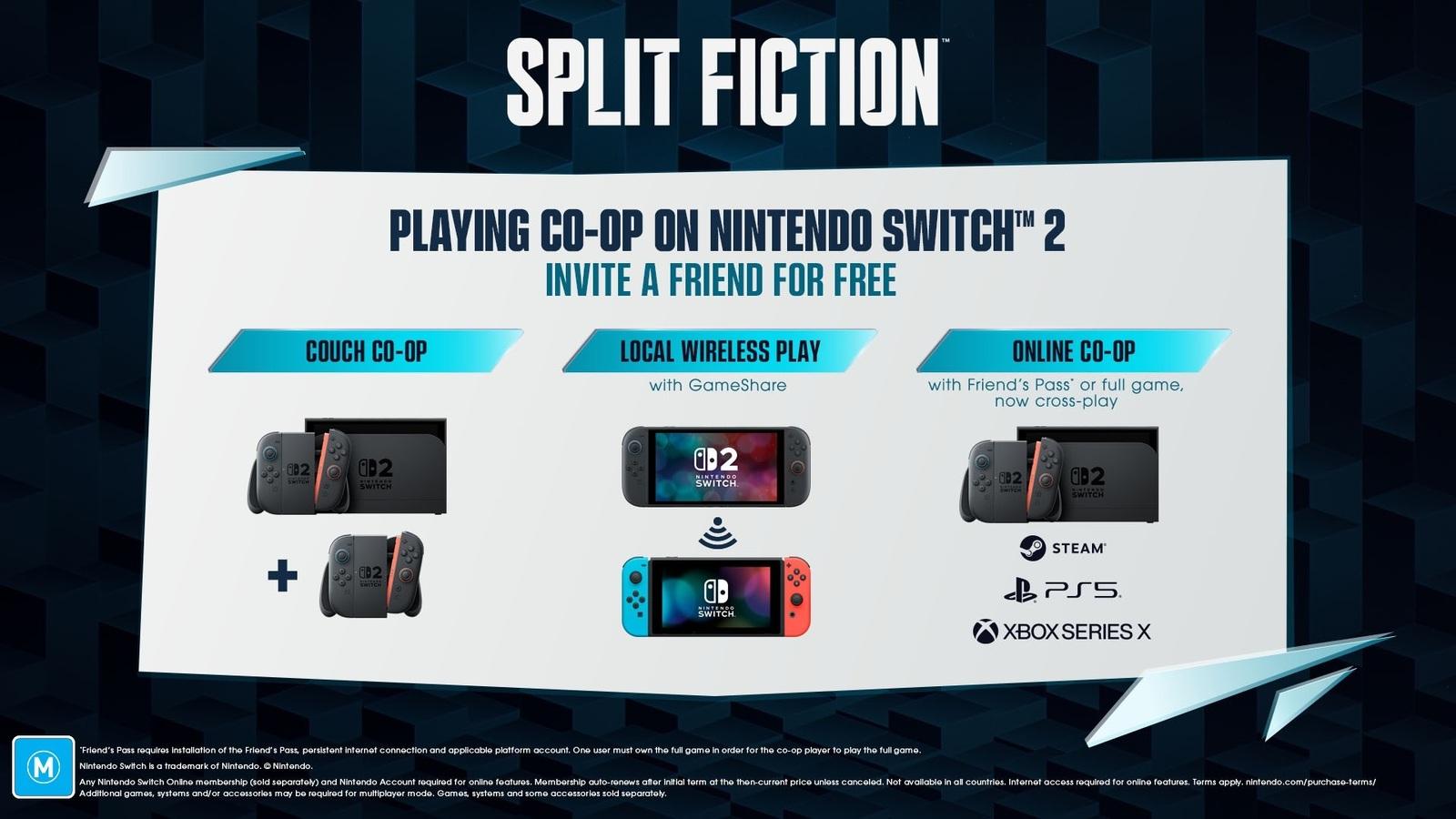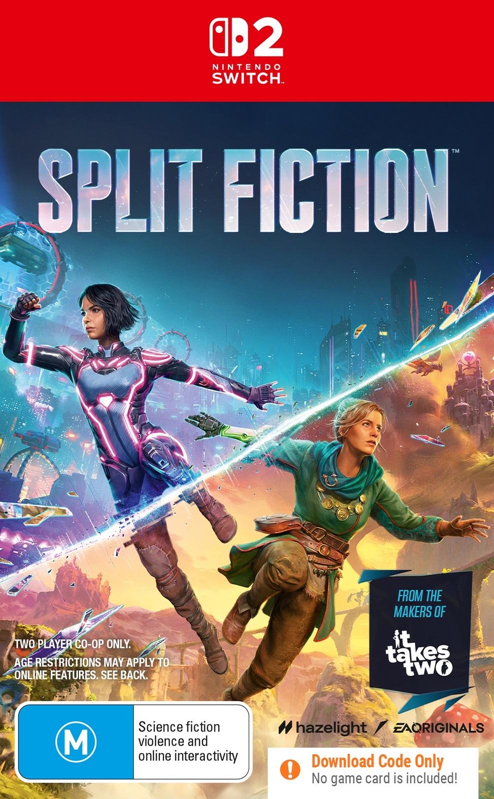 *Split Fiction*Embrace mind-blowing moments as you’re pulled deep into the many worlds of Split Fiction, a boundary-pushing co-op action adventure from the studio behind 2021 Game of the Year Winner It Takes Two. Mio and Zoe are contrasting writers – one writes sci-fi and the other writes fantasy – who become trapped in their own stories after being hooked up to a machine designed to steal their creative ideas. They’ll have to rely on each other to break free with their memories in-tact, working together to master a variety of abilities and overcome diverse challenges while jumping between sci-fi and fantasy worlds in this unexpected tale of friendship.Split Fiction is a unique action-adventure experience that keeps you on the edge of your couch with unexpected moments. One minute you’re taming adorable dragons and the next you’re fighting as cyber ninjas, escaping terrifying trolls, or dodging hover cars thrown by a robotic parking attendant. It’s weird, it’s wild, and it’s designed to be shared.Grab a friend and get ready to overcome any obstacle thrown your way.