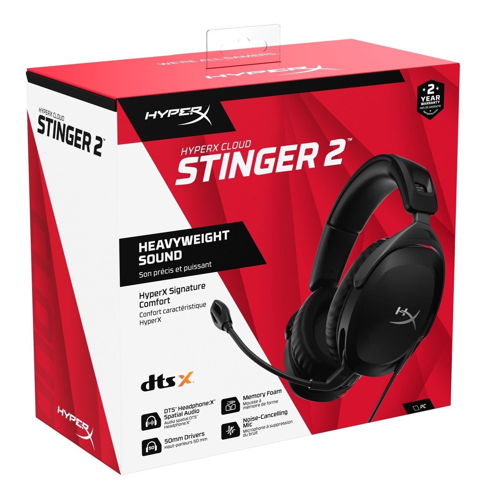 With a new design and 2 years of DTS Headphone:X Spatial Audio\*, the Cloud Stinger 2’s a refined version of the Cloud Stinger. Still under 300g, the Cloud Stinger 2’s light, but delivers a hefty audio punch. Soft memory foam and leatherette provide comfort for all-day gaming. 90° rotating earcups make taking a break easy, with a swivel-to-mute microphone for simple, obvious mic muting. The flexible, passively noise-cancelling microphone’s easy to adjust to your liking.\*DTS, DTS:X, DTS Sound Unbound, Headphone:X, the DTS logo, and the DTS:X logo are registered trademarks or trademarks of DTS, Inc. in the United States and other countries.Features:.* Immersive DTS Headphone:X Spatial Audio* HyperX signature comfort* Superior sound* Adjustable rotating earcups* Easy-Access audio controls* Improved in-game chat experience* Compatibility: PCSpecifications:Headphone:* Driver: Dynamic, 50mm with neodymium magnets* Form factor: Over ear, circumaural, closed back* Frequency response: 10 Hz – 28 kHz* Impedance: 32 Ω* Sensitivity: 97.5 dBSPL/mW at 1 kHz* T.H.D.: ≤ 2%* Frame type: Plastic* Ear cushions: Memory foam and premium leatheretteMicrophone:* Element: Electret condenser microphone* Polar pattern: Bi-directional, noise-cancelling* Frequency response: 100 Hz – 15.6 kHz* Sensitivity: –40.5 dBV (1 V/Pa at 1 kHz)Connections and Features Audio connection:* Wired 3.5mm (4-pole CTIA)* Included virtual surround sound: DTS Headphone:X* Audio controls: Onboard audio controlsPhysical:* Weight: 275g* Cable length(s) and type(s): 2m headset cable, 15cm PC splitter cableView our Headphones Return Policy [Here](https://help.mightyape.co.nz/hc/en-nz/articles/115012111088-Returns-Policy)