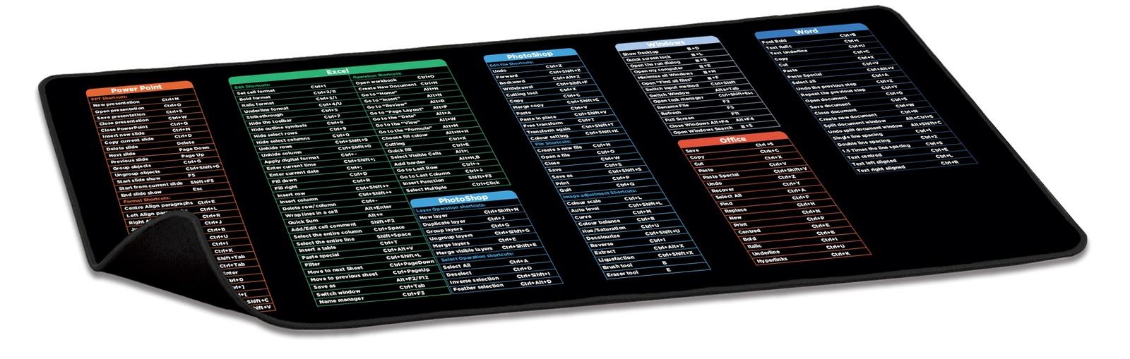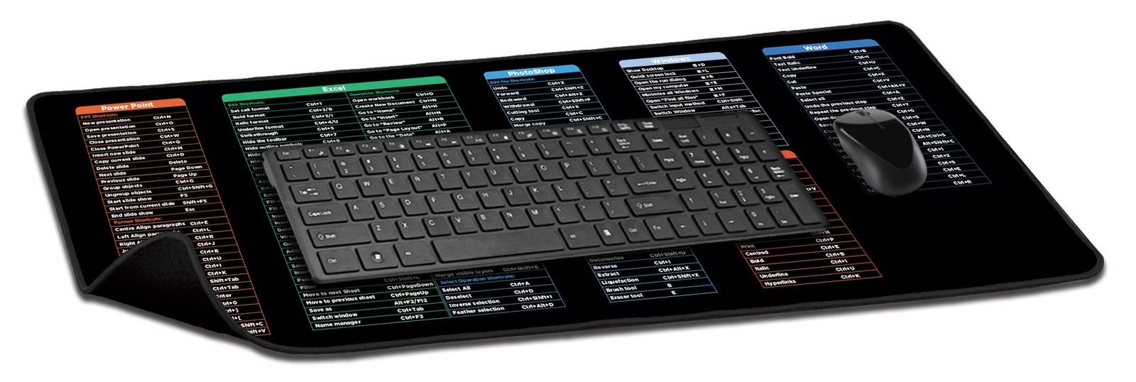 Enhance productivity with printed shortcuts for Excel, Word, Photoshop, Office, Windows, and PowerPoint.Features:* Foldable surface* Anti-slip rubber base* Dust & Water Resistant* Ultra thick 3mm* Size: 800_300_3mm* Material: Polyester surface + Rubber backing* Thickness: 3mmPlease note: Keyboard and mouse are not included