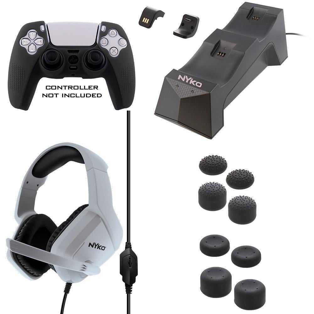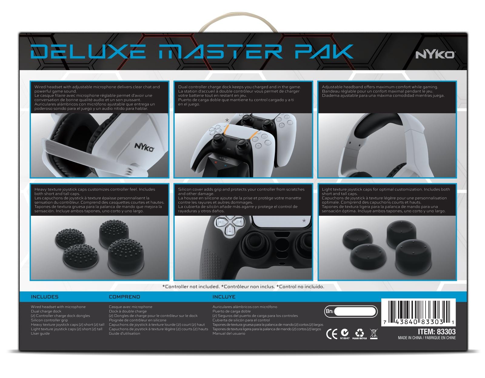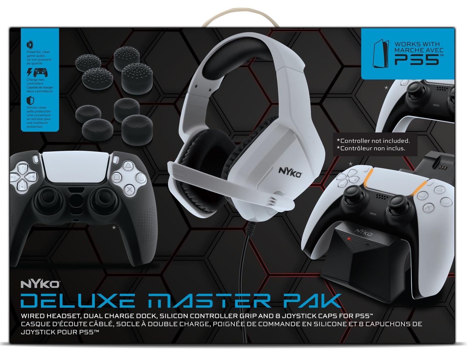 Nyko PS5 Master Pak includes:* Complete console gaming accessory designed with everything a new gamer needs* Wired premium headset for crystal clear game audio and voice chat* 2× Controller Charging dock to keep your controllers in action* Silicone skin provides controller protection and comfort.* 2× Charging dongles to allow controllers to charge on contact.* Comes with multiple sets of small and large thumb caps.View our Headphones Return Policy [Here](https://help.mightyape.co.nz/hc/en-nz/articles/115012111088-Returns-Policy)