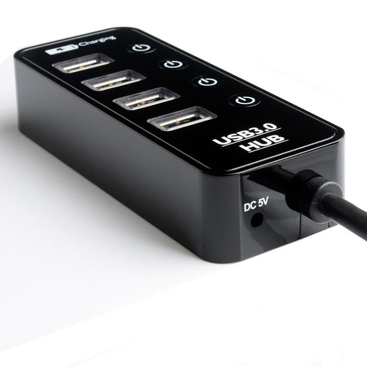 *4-Port Super Speed USB-3.0 Hub – Black*Each interface of the 4-port HUB has an independent switch meaning you can turn on/off the device without unplugging the entire device. Making it easier to manage USB devices, thus saving power and improving environmental protection.It is equipped with a 23.6-inch long sturdy cable and compact design, which is very suitable for at home use, or on the go. Stylish but fully functional design: smooth piano black gloss UV transparent finish, designed with 4 USB 3.0 SuperSpeed data transfer speeds and smart charging ports.Sturdy structure, overload protection, and overcurrent protection. Hardenedindustrial grade 5mm cable can be used for your safe use. It is also equipped with an LEDindicator for power status, supporting overcurrent and instantaneous current protection.* *Please Note:* A DC 5V power adapter (*not included*) can be plugged in to provide high power output for connecting devices with high current demand.*Specifications:** *System Requirements:* – Windows 10, 8.1, 8, 7, Vista, XP, Linux Mac OS, X, etc.* *Compatibility* – Keyboard, mouse, hard drive, printer, satellite receiver, etc.* *Number of interfaces* – 4 ports + 1 port for charging* *Dimensions* – 110 × 44 × 24mm* *Cable length* – 60 cm (Approx.)* *Weight* – 95 grams (Approx.)* *Material* – Alloy plastic, ABS piano paint* *Colour* – Black