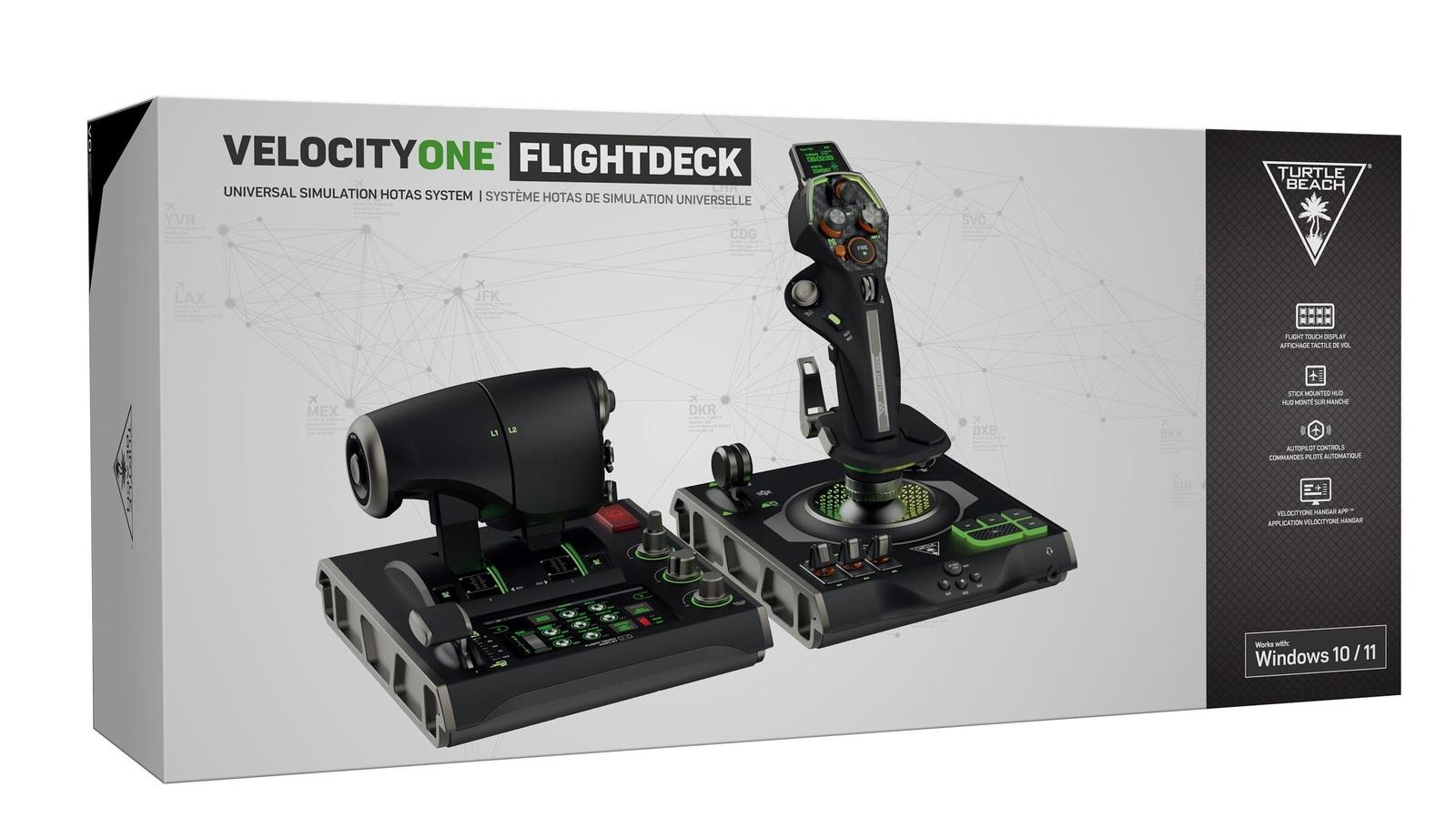 The Turtle Beach VelocityOne Flightdeck is a premium simulation HOTAS system for Windows 10 & 11 PCs, designed for enthusiasts who demand the best. Inspired by advanced spacecraft and state of the art jet fighters to provide the ultimate HOTAS experience for all major combat simulation titles with the future in mind. Comprehensive controls including 15 axes and 139 programmable functions keep you immersed in the action, with your hands on the controls. World’s first Flight Touch Display, and an OLED Head Up Display deliver unprecedented levels of performance optimization, and product customization. Plus, the Flight Hangar app for desktop provides even more product customization and RGB lighting adjustment.*Innovative Flight Touch Display*The world’s first Flight Touch Display combines real-time sim status indication with advanced customization with up to 39 extra button functions set to your configuration.*Customizable OLED HUD*The full-color Head Up Display (HUD) provides access to diagnostics and performance adjustments, allowing you to effortlessly tweak your setup on-the-fly.*Comprehensive, Complete Design*Flightdeck is comprised of two individual USB-connected devices with a complete set of controls for precision dogfights in the air or navigating in six degrees of freedom in space.*Long-Lasting, Precise Hall-Effect Controls*Designed to deliver high-precision, accuracy with durable performance, all main movement controls on the stick and throttle are built using hall-effect non-contact sensors.*Combat-Ready Modular Stick*Complete with exhaustive controls at your fingertips, and unprecedented customization & product performance adjustments, you’ll have tactical superiority in any situation.*139 Programmable Buttons*Equipped with programmable buttons within easy reach on the throttle & stick modules and built into the Flight Touch Display, Flightdeck gives you endless customization options to suit every user’s preference.*Adjustable Stick Height*Designed to accommodate all hand sizes, the height of the stick is fully height adjustable to dial in the perfect fit.*Pro-Aim Focus Mode*Adjust main stick sensitivity for accurate enemy targeting and precise control of landings.*6th-Gen Fighter Inspired Throttle Module*Dual levers include lock switch and haptic detents for effortless multi-engine control.*Adjustable Throttle Detents*Customize your own haptic throttle detent response using the Flight Touch Display. Tune reverse thrust, afterburner, or star drive actuation points to suit your preference or game.*Turtle Beach Audio Advantage*Connect any 3.5mm headset and take advantage of proven Turtle Beach audio functions like Superhuman Hearing, EQ modes, mic monitoring and game and chat balance.*Adjustable RGB Lighting*Whether playing in low light conditions or trying to match the color of your favorite aircraft, you’ll have access to multiple RGB lighting zone adjustments.*Flight Hangar App*The Flight Hangar app for Windows PCs gives you ultimate access to product performance & customization features.Technical Specifications:* PC Software Full Compatibility (with plug-n-play profile): Microsoft Flight Simulator 2020, X-Plane 11 & 12* PC Software Full Control Compatibility\*: Elite: Dangerous, DCS World & Prepar3D\*Full functionality, control mapping required out of box.* PC Software Basic Control Compatibility\*\*: Star Wars Squadrons, War Thunder\*\*Limited functionality, manual control mapping required, sensed as per any standard USB joystick, maximum 32 button inputs.* Input Connectivity PC: 6.5ft / 2m USB-C to USB-A Cable (Throttle), 6.5ft / 2m USB-C to USB-A Cable (Stick)* Companion App: Turtle Beach® Flight Hangar App for additional product features & customization. Available for Windows 10 & 11 PCs* Firmware Updates: Use the Flight Hangar companion app to easily update your controller firmware to get the best possible performance.* Mounting Options: Secure Rubber feet, or pre-drilled holes and mounting screws provided for permanent setups.Package Contents:* VelocityOne Flightdeck* (2) 6.5ft / 2m USB-C to USB-A Cables* M5 Hard-Mounting Screws (3)* Quick Flight Guide