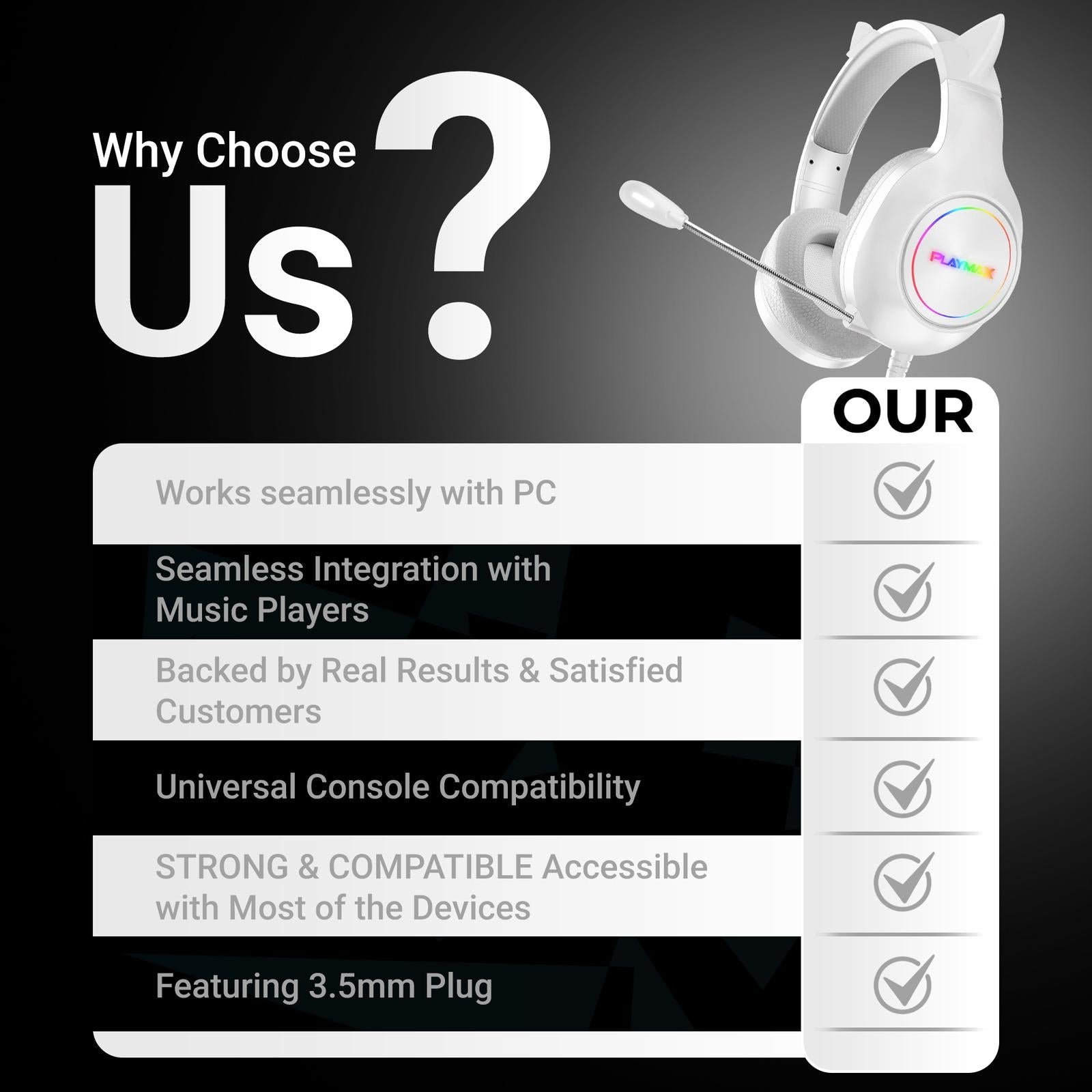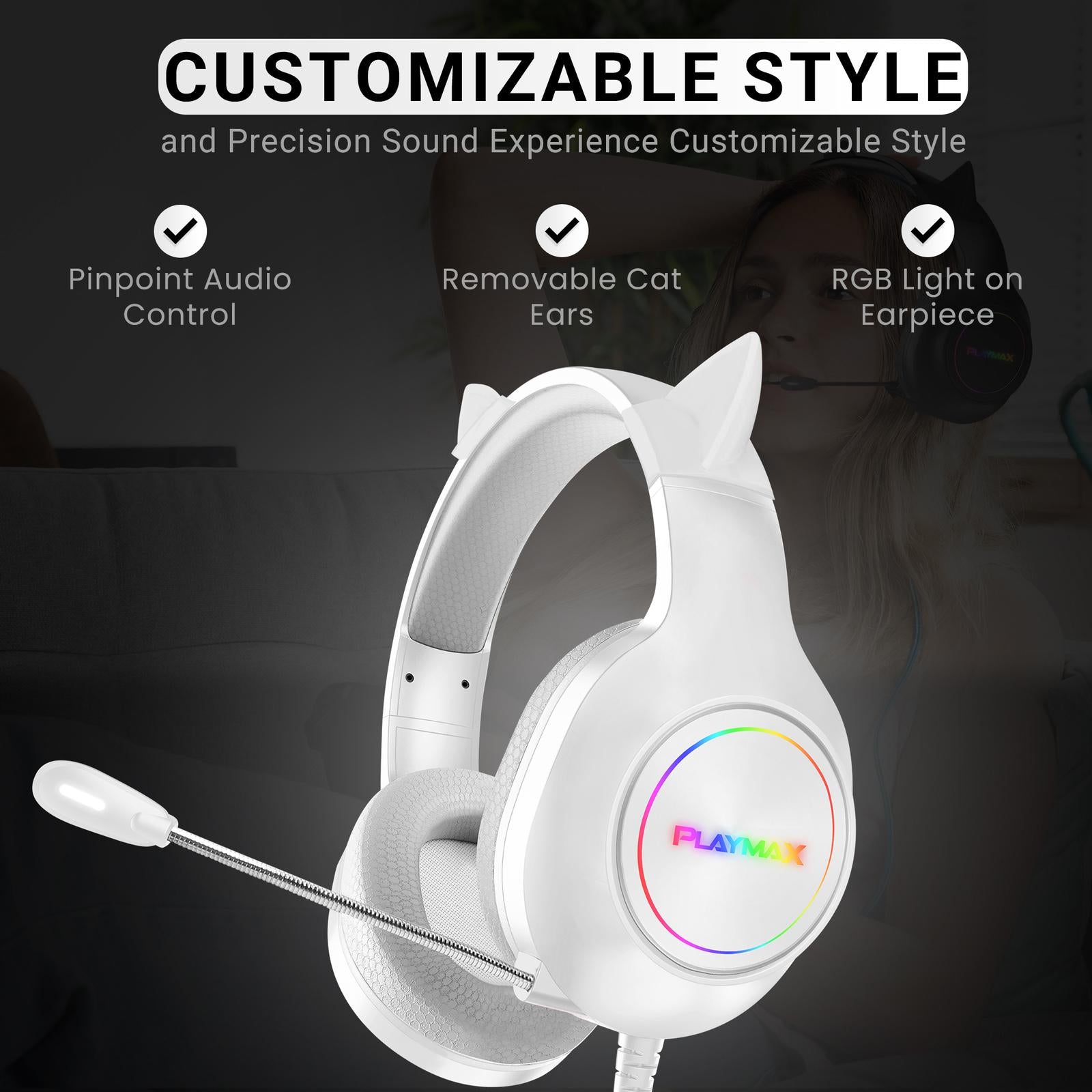 *COMFORTABLE AND BREATHABLE EARMUFFS*Built with long-lasting soft fabric, the replaceable earmuffs ensure extended comfort and resilience—perfect for marathon gaming sessions*50mm LARGE CALIBRE SPEAKERS*Shocking sound gives you a sense of reality. Build-in 50mm high fidelity speakers, which produce rich sound quality, a vivid sound field, high sound clarity and a sound shock feeling. High standard of hardware configuration, providing an excellent gaming and immersive video experience*VOLUME CONTROL & MICROPHONE MUTE*High-precision smooth scroll wheel control headset volume mute, which allows you to control the volume freely.*REMOVEABLE CAT EARS*Using Silicone material, safe, odourless, durable, and non-deformable.*RGB LIGHT ON EARPIECE*The colourful RGB lighting effects greatly highlight the marvelous game atmosphere and provides a cooler gaming experience. It allows the gamer to be more immersed in the game atmosphere as the lighting colour changes.*STRONG COMPATIBILITY*With 3.5 MM plug, microphone and headset which can be compatible with Xbox one, Xbox Series X, Nintendo Switch 1 and 2, PlayStation 4 and 5, computer, laptop etc. The included 3.5mm headphone splitter further extends the compatibility!Specifications:CABLE LENGTH: 2.2mDRIVER DIAMETER: 50mmFREQUENCY RESPONSE: 20hz-20khzMIC SENSITIVITY: –42dB±3dBPLUG TYPE: .3.5mm+USB