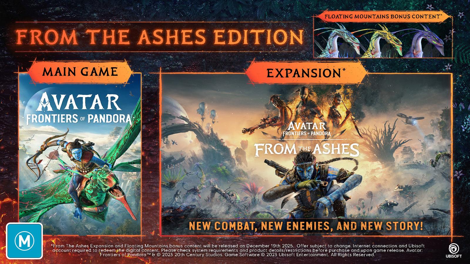 From the Ashes is an expansion inspired by the Avatar: Fire and Ash movie. Play independently from the base game starting December 19, 2025, and embark on So’lek’s journey where he faces a warband of ruthless Ash Na’vi and the RDA.In Avatar: Frontiers of Pandora, experience the never-before-seen Western Frontier:* Explore in first or third person starting December 5, 2025.* Experience the epic and unpredictable Western Frontier in an open world adventure.* Become a Na'vi and customize your character, craft gear, and upgrade skills and weapons to fit your playstyle.* Bond with your own banshee to travel or give you an edge in aerial combat.* Master multiple combat styles, embracing traditional Na’vi or destructive human weapons.* Play the full story campaign in single-player or with a friend online in two-player co-op.^From the Ashes expansion and Floating Mountains bonus content will be released on December 19, 2025. Final content and release dates subject to change. Internet connection and Ubisoft Account required to redeem the digital content.