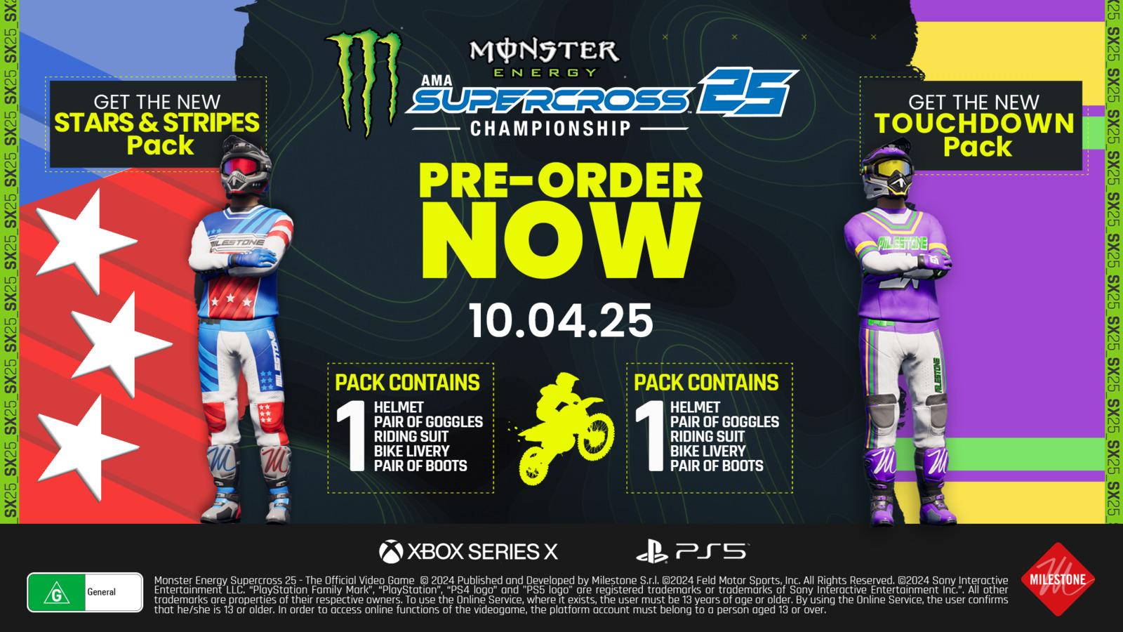 Monster Energy Supercross 25 – The Official Videogame Day One Edition includes:*ENJOY THE OFFICIAL 2025 SUPERCROSS SEASON*Get ahead of the competition with the inclusion of the upcoming Supercross 2025 season! Race on newly designed tracks that mirror real-world races and compete against the latest roster of professional riders. Monster Energy Supercross 25 offers an authentic experience that captures the excitement and energy of the sport's unique events. Don't miss out on the action. Prove you're the best on the track!*BUILD YOUR CAREER ON AND OFF THE TRACK*Live a unique journey filled with crucial moments that will make your path original and unpredictable. With a renewed structure, intense competitions, rivalries, and strategic choices, the new Supercross career mode offers a more immersive and dynamic experience than ever before.*A COMPLETELY RENEWED GAMEPLAY EXPERIENCE*Get right into the action and the dirt! Thanks to Unreal Engine 5, Monster Energy Supercross 25 lets you feel every bump and turn, as you frantically race your field of opponents. Feel the intensity with reshaped ground and air physics, offering more realistic handling and full control over every jump, making each race feel true to life.*EVERY LAP IS DIFFERENT*Every lap presents a new and unpredictable challenge as the track evolves with each turn. Ruts form and deepen, forcing you to adapt your riding on the fly. Navigate the changing surface while maintaining speed and precision. With this feature, every race becomes a high-stakes battle for the best riding lines.*MASTER THE FLOW*Master the art of Supercross with open tutorials and a comprehensive wiki designed for both beginners and seasoned players. Step into the academy to learn essential skills, from basic bike control to advanced techniques like cornering through ruts and nailing perfect landings. And there is more: Monster Energy Supercross 25 now features new Neural Technology riding aids ready to lend a hand to both rookies and seasoned riders.*MAKE EACH RIDE YOUR RIDE*If you’re looking for a truly customized gaming experience, the new editors will let you unleash your creativity far beyond the personalization of tracks and helmets. Craft unique designs and share them with the world thanks to a seamlessly and complete cross-platform experience.*FULL CROSSPLAY FUN*Take the competition global with full crossplay support and immersive online multiplayer modes. Challenge friends or race against players from around the world, regardless of platform, in intense, real-time competitions. Whether you're competing in casual races or battling for the top spot in ranked leaderboards, crossplay ensures a seamless experience across all devices.