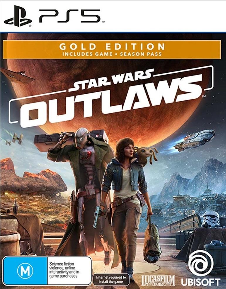 Star Wars Outlaws Gold Edition includes:* 3 days Early Access – Play the game up to 3 days before the official launch date.* Season Pass\*\* – Two DLCs that will release after launch: keep exploring the world of Star Wars Outlaws with all-new stories, quests and areas to discover * The “Jabba's Gambit” exclusive mission available at launch * The “Kessel Runner Character Pack” featuring additional cosmetics for Kay and Nix* Star Wars Outlaws base gameExperience the first-ever open world Star Wars game and explore distinct planets across the galaxy, both iconic and new. Risk it all as Kay Vess, an emerging scoundrel seeking freedom and the means to start a new life. Fight, steal, & outwit your way through the galaxy’s crime syndicates as you join the galaxy’s most wanted.If you’re willing to take the risk, the galaxy is full of opportunity.*DISCOVER A GALAXY OF OPPORTUNITY*Explore distinct planets with bustling cities and cantinas before racing across sprawling outdoor landscapes on your speeder. Each planet brings new adventures, unique challenges, and enticing rewards if you’re willing to take the risk.*EXPERIENCE AN ORIGINAL SCOUNDREL STORY*Live the high-stakes lifestyle of an outlaw. With Nix by your side, turn any situation to your advantage: fight with your blaster, overcome enemies with stealth and gadgets, or find the right moments to distract enemies and gain the upper hand.*EMBARK ON HIGH-STAKES MISSIONS*Take on high-risk, high-reward missions from the galaxy’s crime syndicates. Steal valuable goods, infiltrate secret locations, and outwit enemies as one of the galaxy’s most wanted. Every choice you make influences your ever-changing reputation.*JUMP INTO THE PILOT SEAT*Pilot your ship, The Trailblazer, as you engage in thrilling dogfights with The Empire and other foes, finding the right opportunities to chase, evade, and attack to get the upper hand.\*\*Play the game up to three days before the official launch date. Internet connection and Ubisoft Account required to redeem digital content. Please check system requirements and product details/restrictions before purchase and upon game release.