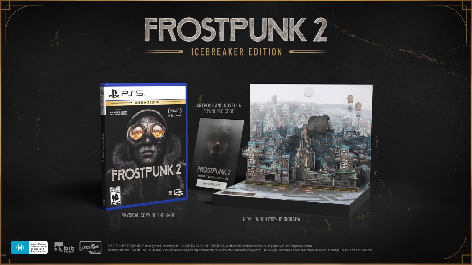 Frostpunk 2 Icebreaker Edition includes:* A meticulously crafted New London pop-up diorama, seamlessly integrated into the O-sleeve packaging, allowing you to display the heart of Frostpunk's frozen city anytime, anywhere.* A redemption code for the official Frostpunk 2 artbook, offering an exclusive behind-the-scenes look at the game's creation, featuring concept art, sketches, and more.* A redemption code for the ‘Warm Flesh’ novella (English version), a gripping short story set in a world where the cold is not the only enemyFrostpunk 2 elevates the city-survival genre to a new level. Take the role of a Steward and lead your city through a cascade of calamities taking place in a postapocalyptic, snowy setting. Build large city districts with their string of endless needs and demands. Navigate through conflicting interests of factions that populate your metropolis. As the needs of the city grow and factional power at its core rises, only you can steer the society towards an uncertain future.*THE CITY GROWS*The world is overtaken by an ever present winter, which makes expansion of the city the only way for the survival of mankind. In order to grow, the metropolis needs resources like coal and oil, just like its citizens require food and warmth. In Frostpunk 2, it's your job to tackle this never ending circle of supply and demand.*PERILS OF HUMAN NATURE*The number of your citizens steadily grows, making the task of governing them and satisfying their demands all the more challenging. As the Steward you will have to maneuver carefully across the interests of many groups inhabiting the city.*FACTIONS*People of your city want to have a voice in how you run things. Each faction has its own ideology and ideas for the future, yet they also have one thing in common -insatiable thirst for power. Choose your allies in the Council Hall wisely.*STORY MODE & UTOPIA BUILDER*The story of Frostpunk 2 introduces a multi-chapter saga set in the frozen wastes. Spanning across the life of the Steward this campaign lets you feel the burden of leadership as you take the responsibility for thousands of lives. At the same time, the sandbox mode called Utopia Builder with infinite play time leaves you room for boundless social and infrastructural experiments.