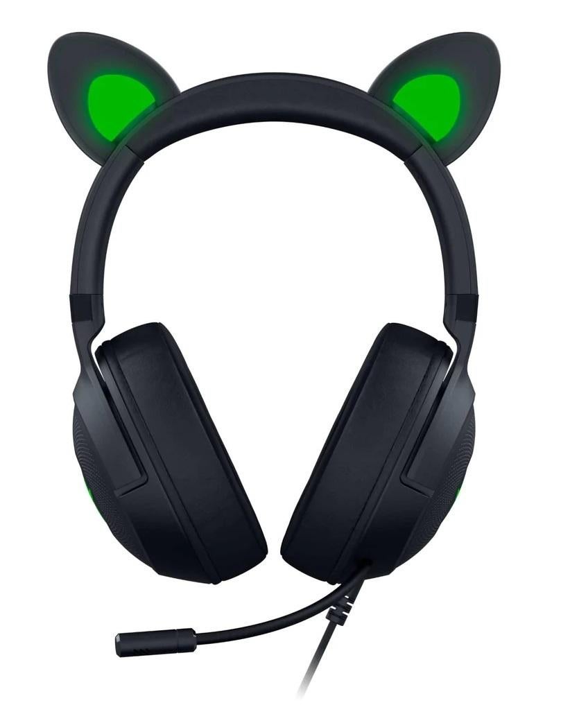 Create your cutest stream persona in killer kitty style with the new Razer Kraken Kitty Edition V2. Stand out and turns heads with unique kitty ears powered by Razer Chroma RGB, as you put on a show with stream reactive lighting and a crystal-clear mic.*KITTY EARS*to express your style. Topped with a pair of unique kitty ears, stand out on stream with a headset that’s styled to match your personality.*STREAM REACTIVE LIGHTING POWERED BY RAZER CHROMA RGB*Display your colorful personality and engage your viewers with earcup lighting that responds to emotes, alerts, and more customizable from over 16.8 million colours and countless effects.*RAZER HYPERCLEAR CARDIOID MIC*For enhanced voice capture. With a sweet spot that’s tuned to pick up less noise from every other direction, the mic has no problems ensuring that your voice is as clear as your style.*RAZER TRIFORCE 40MM DRIVERS*For clear, powerful sound The headset’s patented 3-part driver design pushes out exceptional highs, mids, and lows that doesn’t muddy—providing clarity and quality that sounds as good as it looks.*7.1 SURROUND SOUND ACCURATE POSITIONAL AUDIO*Heighten your game awareness and let nothing escape your kitty ears with accurate positional audio that lets you pinpoint where every sound is coming from.\*Only available on Windows 10 64-bit*HYBRID FABRIC AND LEATHERETTE CUSHIONS*For all-day comfort and noise isolation. Don’t just look good—feel good. The headset’s snug, comfy earcups allow you to stream for hours without feeling fatigued, while their great noise isolation lets you game with uninterrupted immersion.Tech specs:*HEADPHONES*• Ears: Fixed Kitty Ears• RGB: 2 Razer Chroma™ RGB Zones (Ear and Earcups)• Frequency response: 20 Hz – 20 kHz• Impedance: 32 Ohms• Sensitivity: 92.5 dB SPL/mW@1KHz• Drivers: Customized Dynamic 40mm Driver• Inner ear cup diameter: 61 × 43mm• Connection type: USB Type A• Cable length: 2.0m / 6.56 ft• Approx. weight: Est. 300g / 0.66 lbs• Oval ear cushions: Full-ear fabric and plush leatherette*MICROPHONE*• Frequency response: 100 Hz – 10 kHz• Signal-to-noise ratio: ≥ 60 dB• Sensitivity (@1 kHz): –42 dBV/Pa• Pick-up pattern: Unidirectional*ON-EARCUP CONTROLS*• Volume up and down• Mic mute on/off toggle*AUDIO USAGE*• Wired audio usage: USB Type A• Surround sound: Only available on Windows 10 64-bit (or higher)