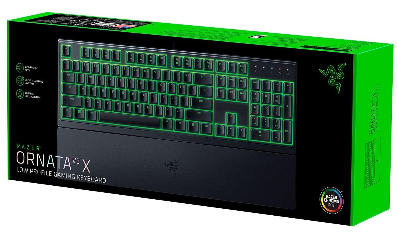 Take the first step towards next-level performance with the Razer Ornata V3 X—a low-profile ergonomic gaming keyboard designed to elevate your work and play. Featuring a new ultra-slim form factor, more durable keycaps, and Razer Chroma™ RGB, it is the perfect introduction to our unfair advantage.*Ergonomic Gaming Experience*With slimmer keycaps and shorter switches, enjoy natural hand positioning with a low-profile ergonomic gaming keyboard that allows for long hours of use with little strain.*Soft, Cushioned Touch*The Razer Ornata V3 X is perfect for those who prefer a quieter, more comfortable experience when gaming or typing.*Improved Fade and Scratch Resistance*More durable than regular keycaps, the UV coating ensures more fade-resistant legends and greater protection against wear and tear from frequent use.*Complete Assurance*The Razer Ornata V3 X’s sturdy build is tanky enough for those intense gaming sessions and can shrug off the effects of minor spills.*Extended Gaming Support*Aligns perfectly to the low-profile keyboard and provides the perfect place to rest your wrists—for support that’s vital during long periods of use.*Customizable Lighting*With 16.8 million colors and a suite of RGB effects to choose from, personalize the keyboard and get access to dynamic lighting effects for hundreds of Chroma-integrated games.TECH SPECS:* SWITCH TYPE – Razer Mecha-Membrane Switches* SIZES – Full Size* LIGHTING – Single Zone Razer Chroma RGB Lighting Zones* WRIST REST – Yes* ONBOARD MEMORY – None* MEDIA KEYS – None* PASSTHROUGH – None* CONNECTIVITY – Wired – Attached* KEYCAPS – UV-coated ABS Keycaps* OTHERS: ** Durable spill-resistant design** Cable routing options** Razer Synapse enabled** Fully programmable keys with on-the-fly macro recording** 6-key roll over** Gaming mode option** Braided fiber cable** 1000 Hz Ultrapolling