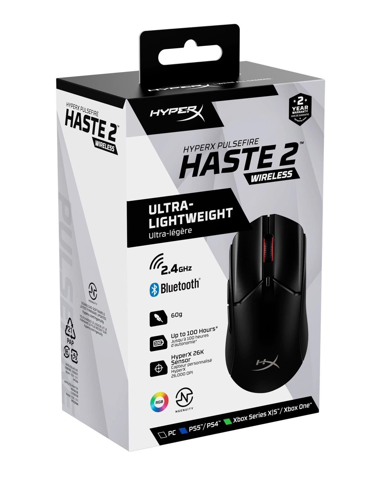 The HyperX Pulsefire Haste 2 Wireless has a solid upper shell, but keeps the 61g weight and 100 hour\*\* battery life of the original Pulsefire Haste Wireless. It adds dual mode wireless to switch between 2.4GHz wireless and Bluetooth connections. We’ve also included our high performance HyperX custom components, highlighted by the HyperX 26K Sensor which detects 26,000 DPI natively and custom HyperX Switches rated for up to 100 million clicks. You’ll also enjoy superior physical control of your mouse with virgin PTFE skates and grip tape.Features:* Up to 100 hours of battery life* Ultra-lightweight 61g design* Dual wireless connectivity modes* Precision HyperX 26K Sensor* Custom HyperX Switches* Virgin PTFE Skates and Grip Tape* Seamlessly switch to wired mode* Customizable with HyperX NGENUITY SoftwareMouse Specifications* Shape: Symmetrical* Sensor: HyperX 26K Sensor* Resolution: Up to 26000 DPI* Speed: 650 IPS* Buttons: 6* Left / Right Button Switches: HyperX Switch* Left / Right Button Durability: 100 million clicks* Light Effects: Per-LED RGB lighting\** Onboard Memory: 1 profile* Connection Type: 2.4GHz Wireless / Bluetooth 5.0 / Wired* Charging Type: USB-C* Polling Rate: 1000HzBattery Specifications* Battery Type 370mAh Li-ion polymer battery* Battery Life Up to 100 hours\*\*Physical Specifications* Length: 124.3 mm* Width: 66.8mm* Weight: 60 g / 61 g* Cable Type: Detachable HyperFlex 2 USB-C to USB-A Cable* Cable Length:: 1.8 m / 5.9 ft\*Per-LED RGB lighting customizable with HyperX NGENUITY software\*\*Tested under continuous usage with lighting disabled. Battery life varies based on usage and computing conditions