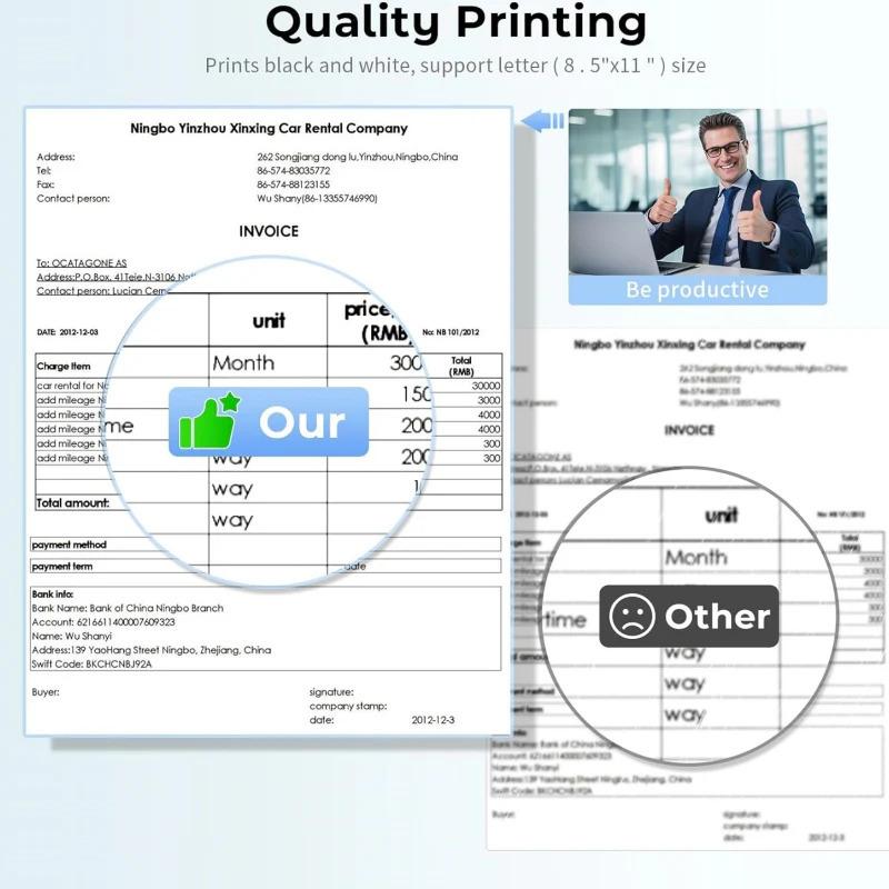 M08F portable printer is quite small in size, not very heavy and easy to carry around. It is great for portability and traveling."Mobile Device Printing: Easily print from your iPhone, iPad, or Android with the Phomemo App.Compact and Space-saving Design: Portable printer weighing just 2lb and only 1.5in thick, able to fit in your bag or briefcase for easy transporting and surprisingly light for long commute times. Our travel printer great concept for On-site printing from anywhere needed, like if traveling for work, business, office, home, car, or university for example.Inkless Printing: Small Printer use thermal technology – don't require ink, toner, or ribbons, no ink-related blockages and cleaning issues. And instead you only need to replace the thermal paper and you're good to go, each thermal paper costs only $0.12, cheaper than traditional ink cartridges + paper.Strong Compatibility: Print PDF, Word, Images, Web from your phone—whenever, wherever. You can also use a USB cable to connect for computer printing.High Quality Printing: The M08F-Letter thermal printer provides superior print clarity resulting in hassle-free printing- high quality crisp, dark imaging and smooth printing effects and fast processing.(Black and white print)This wireless bluetooth printer is suitable for “Phomemo M08F Letter Thermal Paper”, using other consumables from unknown sources may reduce the life of the printer.How to Print on Phones -1.) Power on printer. You may have to hold the power button (top left) down for a few seconds if it doesn't come on with one click.2.) Download the “Phomemo” from your app store.3). Enable BT on your phone > return to the Phomemo app & click to add device.4.) Selected the M08F-Letter (for this model)- wait for it to pair & BOOM you should be connected. It took not even 5 minutes to set-up & print. \*\*If pairing took to long – reboot the printer by holding the power button down then back on again & return to the app to pair. It was so easy to set up.*Features:** Portable and Compact: Quick printing on the go or business traveling.* No Ink Printing: No need ink, toner, or ribbons, just carry thermal* High Quality Printing: M08F-Letter bluetooth wireless printer is equipped with high-quality print head, Easy to achieve clear printing effect* Print Anytine Anywhere: Whether you are at work or in life, M08F is a good helper for you to solve all problems.* Easy to Set Up: Suitable for installation by people who don't know much about computers. We have made a Quick Start Guide for you to learn to use the printer easily* College Students: It has internal battery so you don't need power source. You can print up to 140 pages on a single charge* On the Drive: Silicone pad on the bottom to protect your Portable Printer* Business: M08F-Letter can not only print Word, PDF, but also web pages, pictures, and even tattoos… (ONLY monochrome)* Clearer Print: Phomemo M08F-Letter uses an upgraded printing algorithm, it is recommended to match (Phomemo thermal paper 8.5"x11") original consumables to make your printing clearer.* Expand Your Business Anywhere Phomemo M08F-Letter portable printer is very suitable for temporarily printing invoices, lists, etc. on site* High Compatibility: Easily print documents, pictures, web pages from your mobile phone.If you need computer printing, please use a USB cable to connect (PC driver download website m08f.phomemo.com)*Specifications:** Tiny And Lightweight: Weighs only 2 lbs, 1.5" thick, dimensions 310×68×41mmPower And Capacity: Lithium battery, 1200mAh* Wide Range Of Applications: A portable printer can be used at work, business, office, home, car, or while traveling* Printing Efficiency: 1200mAh battery capacity, up to 140 pages of continuous printing after charging* High Compatibility: Supports Bluetooth connection for IOS and Android phones and tablets, and can also be connected with a USB data cable for computer printing* High Definition: 203dpi, dark color imaging, smooth print results, and fast processing* Inkless printing: Thermal printing technology eliminates ink, toner, and ribbon costs* Paper Size: A4/Letter* Power Input (A): 5V⎓2A* Printing Speed(mm/s): 13–15mm/s* Charging Interface: TypeC* Battery Capacity(mAh): 1200mAh* DPI: 203DPI*What's in the box?** M08F portable printer x1* Letter thermal paper x10 sheets* Soft storage pouch x1* USB-A to USB-C charging cable (80cm) x1* Instructions, Quick Start Guide x1*Attention:*1. Must use a USB cable to use the PC, currently M08F don't support Bluetooth to connect to the PC.2. Please keep the thermal paper in a room temperature and dark environment, and it can be stored for up to ten years.Note: Overheating of the machine can cause paper jams!!!● If the pattern is too complex or large shaded pattern, the machine needs to process too much information and the machine will easily overheat, resulting in a paper jam.● Do not transfer complex patterns continuously, you need to wait until the cover is opened to allow the machine to cool down sufficiently. Touch the thermal metal print head to see if the machine is cool.