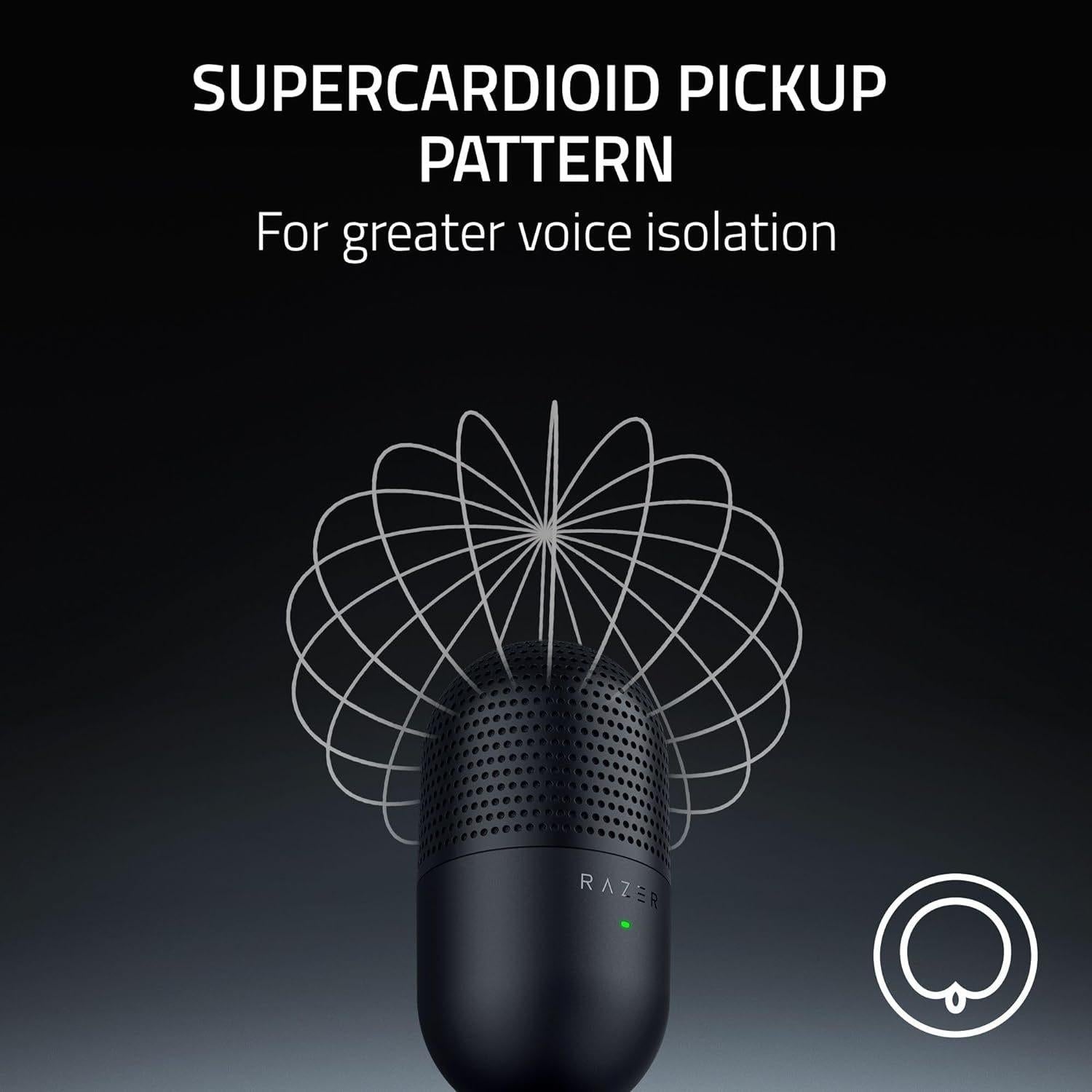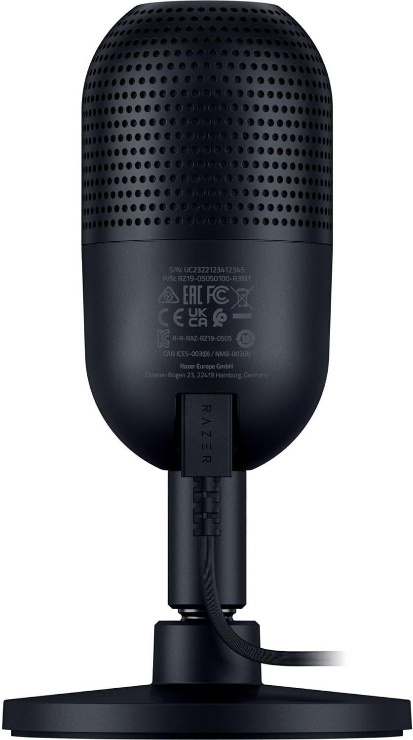 Meet the Razer Seiren V3 Mini—an ultra-compact USB microphone that now packs even more. Featuring a new tap-to-mute function and advanced audio customization, enjoy studio-quality voice capture with the perfect pint-sized companion for gaming, streaming, and chatting.*Crystal-clear Voice Capture*Fitted with a custom condenser capsule, the mic's impressive sensitivity can capture more detail especially at higher frequencies, ensuring it broadcasts your voice with stellar clarity and quality.*Greater Voice Isolation*A tighter pickup pattern allows the mic to focus on your voice while suppressing room noise, so you’ll never have to worry about sounds like typing or mouse clicks getting in the way.*Instant Control*Whether you’re gaming, chatting, or streaming, instantly prevent audio mishaps by simply tapping the top of the mic, and tell at a glance if the mic is active or not with an LED status indicator.*Dampens Noise*Find your sweet spot with a tiltable mic stand that also features a built-in shock absorber to dampen noise caused by accidental knocks and bumps. Can be detached for a boom arm setup.*Fuss-free Setup*Be ready to game, stream, or chat in seconds. Simply plug the USB mic to your PC and you’re good to go—no software or drivers required. Works with Discord, OBS Studio, and XSplit.*One-stop Control*Create the perfect setting from one powerful platform. Personalize the mic’s lighting, set studio-level sample and bit rates, manage your stream mix to set separate volume mixes for playback and your stream, and more.Tech specs:* SAMPLE RATE – 96 kHz* BIT RATE – 24 bit* CAPSULES – 14 mm condenser capsule* POLAR PATTERNS – Supercardioid* FREQUENCY RESPONSE – 20 Hz – 20 kHz* POWER REQUIRED – 5 V / 350 mA* SENSITIVITY – –36 dB (1 V / Pa at 1 kHz)* MAX SPL – 110 dB* IMPEDANCE – None* POWER OUTPUT – None* THD – None* SIGNAL-TO-NOISE RATIO – None* CONNECTION TYPE – Type A to Type C USB Cable* OTHERS – None