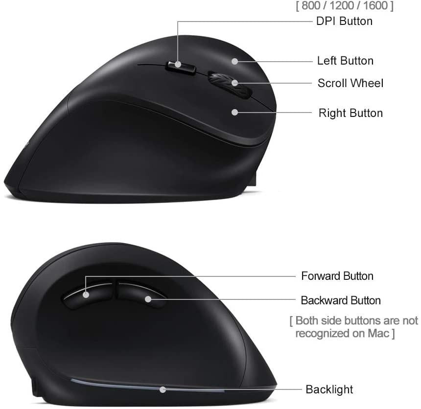 *Unique ergonomic design:* The unique ergonomic shape tightly supports your palm, and the proper vertical design enables your hands and arms to grip naturally. Compared with ordinary mice, it can effectively reduce wrist fatigue and pain. (Note: This is a right-hand mouse)*Matte non-slip coating:* This mouse has a matte coating, which is very comfortable to use. It also has non-slip properties, which is especially suitable for people who work on the computer for several hours a day.*Additional function buttons:* We have added forward/backward buttons to provide convenience when browsing web pages and documents. This is an excellent choice for Internet surfers, gamers and people who work on computers for extended periods of time.*Easy to use:* Plug and play. Just connect the receiver to a laptop or computer to use theproduct. This product is compatible with Windows 8/7/10/Vista/XP/2000, Mac, Linux, etc.*Power saving & energy saving:* There is an independent switch button on the back of the mouse for enabling energy saving mode.*Specifications:** *Contents* – 1 x Mouse, 1× 2.4G USB Receiver, 1 x Micro USB Cable, 1 x Manual* *Compatibility* – Windows, Linux, Mac (Note only limited Apple functionality)* *Dimensions* – 4.84 × 3.54 × 2­.87 inches* *Wireless transmission frequency* – 2.4GHz* *Operating distance* – 8–10 meters (Barrier-free)* *Charging time* – 2–3 hours (Approx.)* *Mouse size* – rat (≥120mm)* *Battery capacity* – 400mAh* *DPI* – 800–1200–1600* *Interface* – USB 2.0* *Colour* – Black
