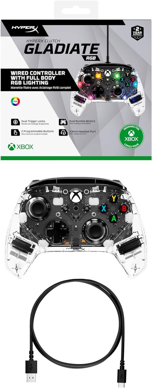 The HyperX Clutch Gladiate RGB Gaming Controller is built for Xbox players that want a premium controller that can provide precision and customizable controls you can optimize for your playstyle. This officially licensed wired Xbox controller features dual trigger locks and remappable rear buttons so you can take control of the game your way. Powerful dual rumble motors and impulse triggers take immersion and force feedback cues to a whole other level. Showcase your style with the Clutch Gladiate RGB’s full-body lighting, 3 different effects and 7 different colors of customization, no software required. It also features a 3.5mm stereo jack so you can easily connect your favorite wired headset, and a USB-C to USB-A connector so you can plug it directly into XBOX Series X|S consoles.Features:* Officially Licensed by Xbox* Full-body, customizable RGD lighting* Dual rumble motors* Impulse triggers for next-level immersion* Dual Trigger Locks* Two programmable rear buttons* 3.5mm stereo jack & USB-C connection* Easily share your highlights
