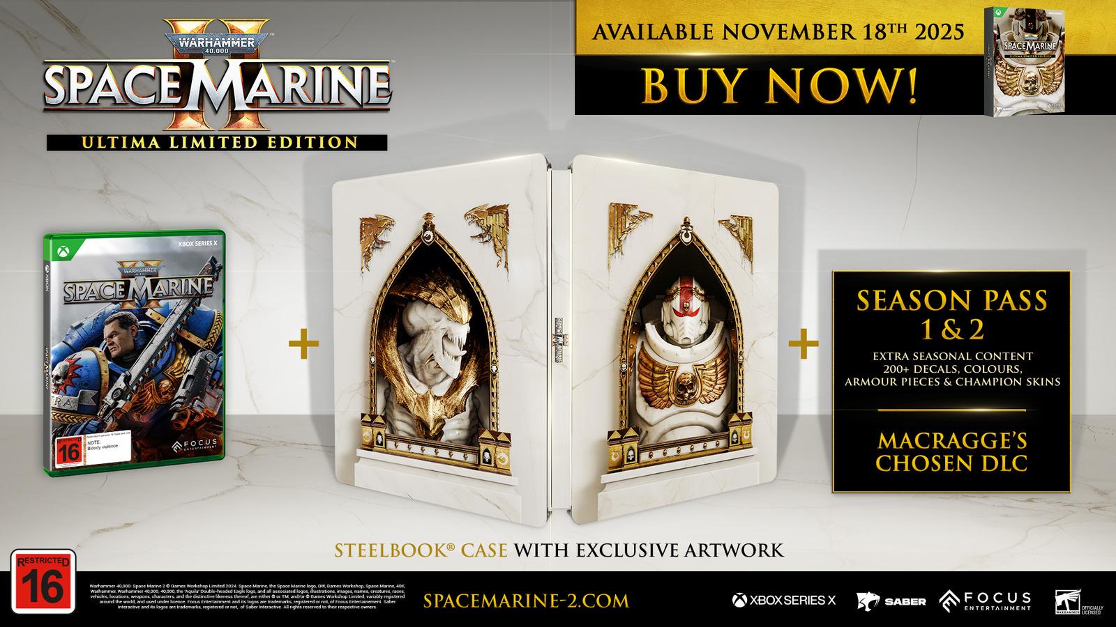 Warhammer 40,000 Space Marine 2 – Ultima Limited Edition includes:* Warhammer 40,000: Space Marine 2* SteelBook case with exclusive artwork* Season Pass 1* Season Pass 2* Macragge's Chosen DLC*YOUR CRAFT IS DEATH*Embody the superhuman skill and brutality of a Space Marine, the greatest of the Emperor’s warriors. Hold at bay the horrors of the galaxy in epic battles on far-flung planets with your deadly abilities and devastating weaponry. Uncover dark secrets to drive back the everlasting night and prove your ultimate loyalty to humanity.Crush the Tyranid swarms. Defend humanity.Features:* Purge the relentless Tyranid swarms as legendary Space Marine Titus in a spectacular new campaign. Play solo or with up to 2 friends in 3 player co-op.* Enjoy intense, gory and fast-paced third-person action with hundreds of enemies on screen, from the creators of blockbuster co-op shooter World War Z.* Defend the Imperium as your own Space Marine in an endlessly brutal and replayable PvE missions up to 3 players featuring 6 classes, unlocking new skills and cosmetics.* Wage eternal war on your enemies in ferocious 6v6 PvP matches and bring glory to your faction!