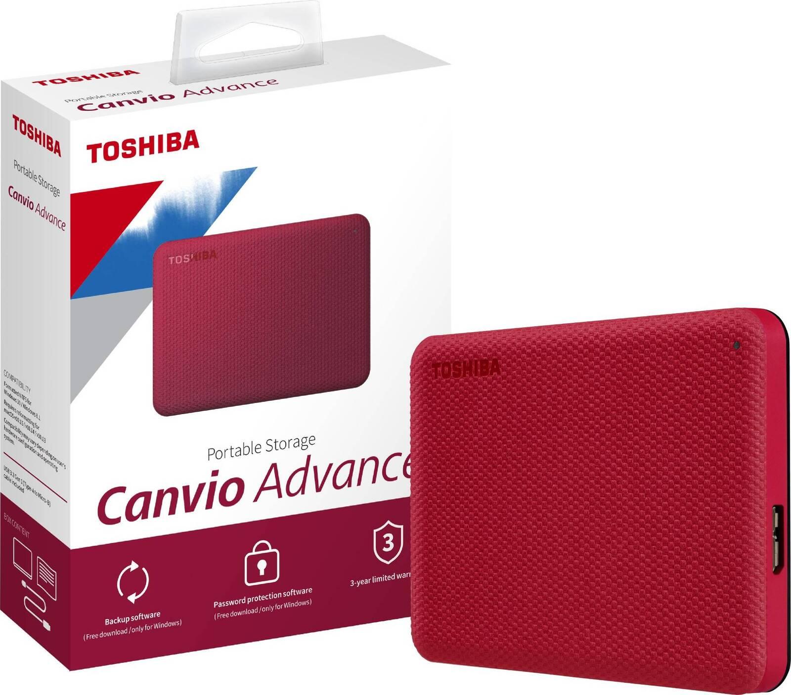 This Toshiba Canvio Advance Hard Drive will help you store and backup files, adding a peace of mind to your computing and giving you a copy of documents you can take on the go. Your storage is protected by a password lock feature and downloaded auto-backup software.*Features:** The hard drive has a compact and portable design, making it easy to carry on the go so you can access and share your files as necessary.* It has a 4TB capacity for you to store your photos, videos, documents and other important files.* It connects via USB 3.0 for ultra fast data transfers, plus it's also backwards compatible with USB 2.0 devices.* The hard drive is powered by its USB connection to your device so you don't need to worry about carrying an extra power source.* It supports plug and play functionality so you don't need additional software or drivers to get started.* This hard drive comes ready to go with devices running Windows 7, 8.1 and 10 as well as MacOS.* This hard drive comes with a 3 year warranty for your peace of mind.* Comes in a dashing red design*System Requirements*Formatted NTFS for Microsoft® Windows® 11, Microsoft® Windows® 10, Windows® 8.1. One free USB 3.2 Gen 1 or USB 2.0 port. Requires reformatting for macOS v10.15/v10.14/v10.13*Technical Specifications** *Platform:* External* *Capacity:* 4.0TB* *Form Factor:* 2.5"* *Interface:* USB 3.2 Gen 1* *Powered:* USB* *Unit Colour:* Red Texture Finish* *Software:* Toshiba Backup Software | Toshiba Security Software (password lock) | Auto-diagonostic* *Unit Dimensions (W x H x D mm):* 109 × 78 × 14* *Weight (g):* 149
