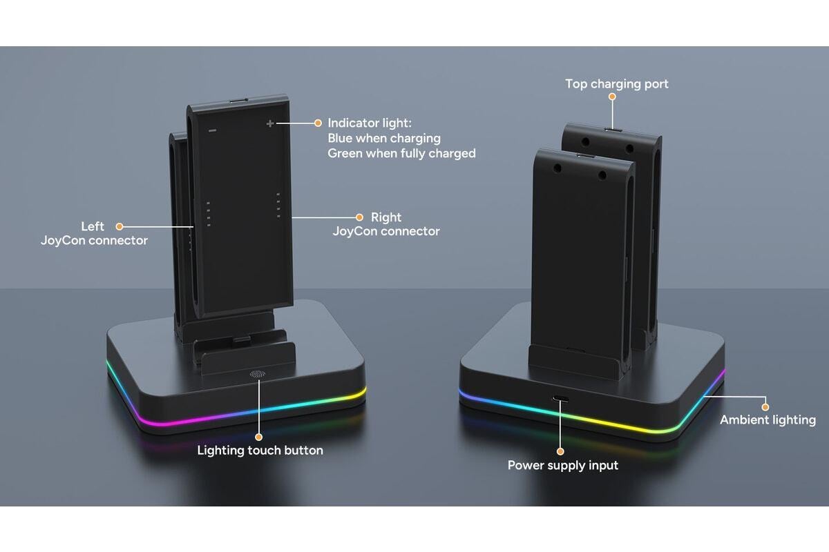 Never run out of power mid-game with the 4-in-1 Charging Dock for Nintendo Switch 2 Joy-Cons. Designed to charge up to four controllers simultaneously, it keeps your gaming setup organised and ensures your Joy-Cons are always ready to play.* Charge up to 4 Joy-Cons. Keeps controllers powered and organised.* Charge while you play. Detachable chargers let you charge mid-game.* Dual charging options. Use the dock or charge directly via USB-C.* Built-in protection circuit. Prevents overcharging and short circuits.* LED indicators. Red when charging, green when fully charged.* Customisable RGB light. Choose between rainbow or single-colour modes.Charge multiple Joy-Cons at onceNo more waiting for controllers to charge one by one. This charging dock allows you to power up to four Joy-Cons simultaneously, so you’re always ready for multiplayer gaming sessions. Plus, it keeps your controllers neatly stored in one place.Play and charge at the same timeKeep gaming even when your controllers are running low. The removable charging stands let you charge your Joy-Cons while playing\*, so you don’t have to pause the action. Simply detach the chargers from the dock, plug in a USB-C charging cable with a charging source such as your console or a power bank, and continue gaming uninterrupted.Smart and safe chargingEquipped with an integrated protection circuit, this charging dock safeguards your Joy-Cons from overcharging, overheating and short circuits. You can confidently leave your controllers to charge without worrying about damage or reduced battery lifespan.Sleek design with customisable lightingEnhance your gaming setup with built-in RGB lighting. Choose between a rainbow effect or select one of seven single-colour modes to match your gaming atmosphere, making your charging dock a stylish addition to your Nintendo Switch accessories.