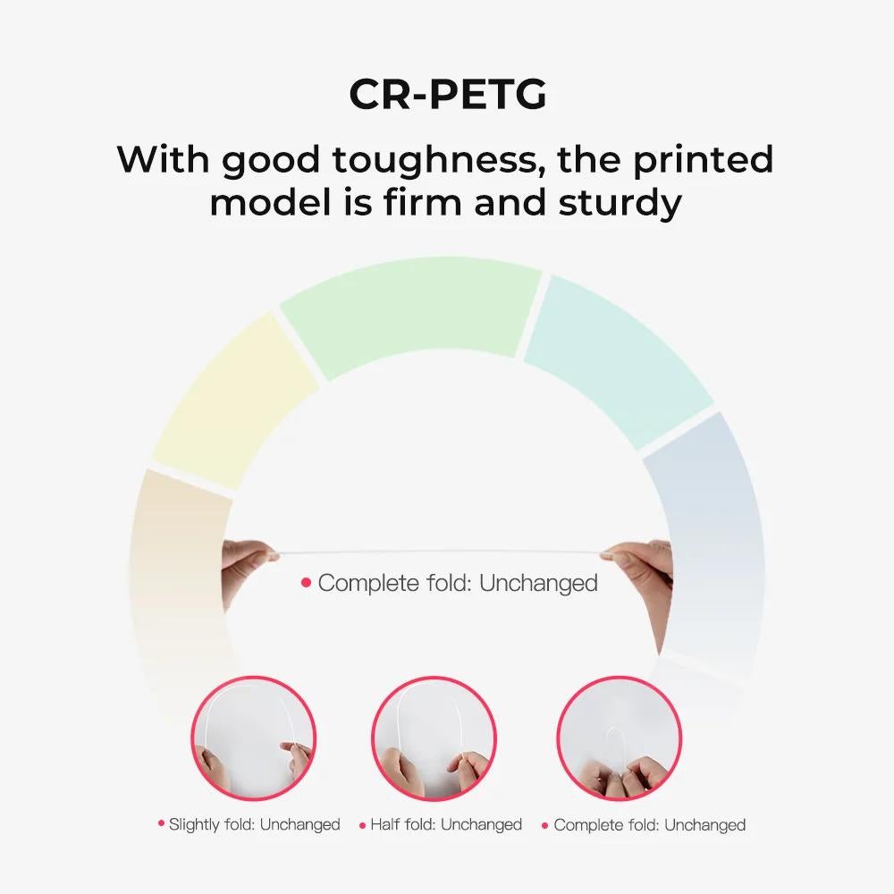 *It has the advantages of both PLA and ABS filaments.** Eco-friendly, odorless and non-toxic* Excellent stability and moisture resistance* With good toughness, the printed model is firm and sturdy* Transparent and Glossy* Multiple colors give you a colorful world* Simple operation and good compatibility*Technical Specifications** *Product name:* CR-PETG* *N.W:* 1kg* *Printing temperature:* 230–250℃* *Tensile strength:* 49MPa* *Package weight:* 1.15kg* *Bubble:* No* *Package size:* 210_210_75mm* *Filament diameter:* 1.75mm* *Tolerance:* ±0.03mm