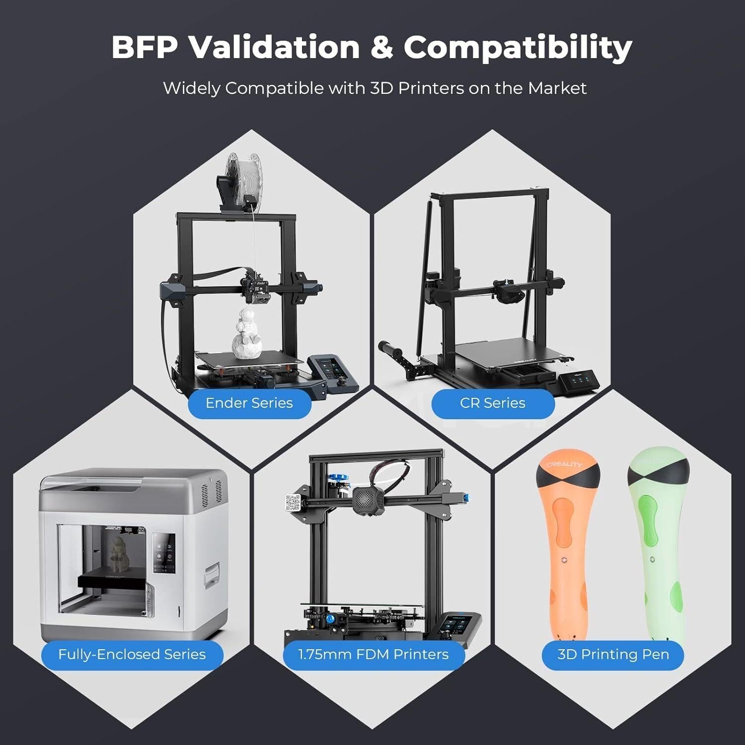 *_Creality 3D Printer PLA Filament Meet Different Needs_*Creatity 3D Printer PLA Filament can be used in toy model, household products, school education, architectural model, self-made, etc. You can download related models from the creality cloud, start to print your own figurines, miniatures, or cosplay props.*Features:** Print without Warping: Creality Ender PLA 3d printer filament made of environmentally friendly PLA material, the printed model is low shrinkage and easy to print without warping* Dimensional Accuracy & Consistency: PLA filament adaptive control system guarantees precise filament diameter control of 1.75 mm during the manufacturing process, accuracy +/- 0.02mm, 1kg spool (2.2lbs)* Smooth Printing without Clogging: High-purity and impurity-free raw materials, the good fluidity enables the filament to be extruded evenly and smoothly during printing. Stable Wire Diameter, no clogging to the nozzle, no bubble generation, improving the printing success rate* Neat Winding and Less Tangle: Creality PLA filament 1.75mm adopt neat EPC automatic winding arrangement process to ensure the line tidy and less-tangle, avoiding possible breaks and thread breakage* Vacuum Packing without Bubbles: Creality PLA 3d printing filament with desiccant independent packaging 24h after boxing, vacuum packaging does not leak air to effectively avoid the production of air bubbles* Wide Compatibility: Verified by BFP, Ender PLA filament perfegtly compatible with Creality 3D printers Ender series, CR series, Fully-Enclosed series and compatible with 1.75mm FDM Printers in the market*Specifications:** Product Name: Ender-PLA Filament* Bending Strength: 77MPa* Recommend Hotbend Temperature: no heating –60C* Density: 1.25G/CM* Charpy Impact Strength: 7J/M* Recommend Print Speed: 40–80mm/s* Filament Diameter: 1.75+0.02mm* Product Net Weight: 1Kg/2.2lb* Tensile Strength: 34MPa* Recommend Fan Speed: 100%* Recommend Print Surface: Carborundum glass platform, PEI Platform, Crepe Tape, PVP glue