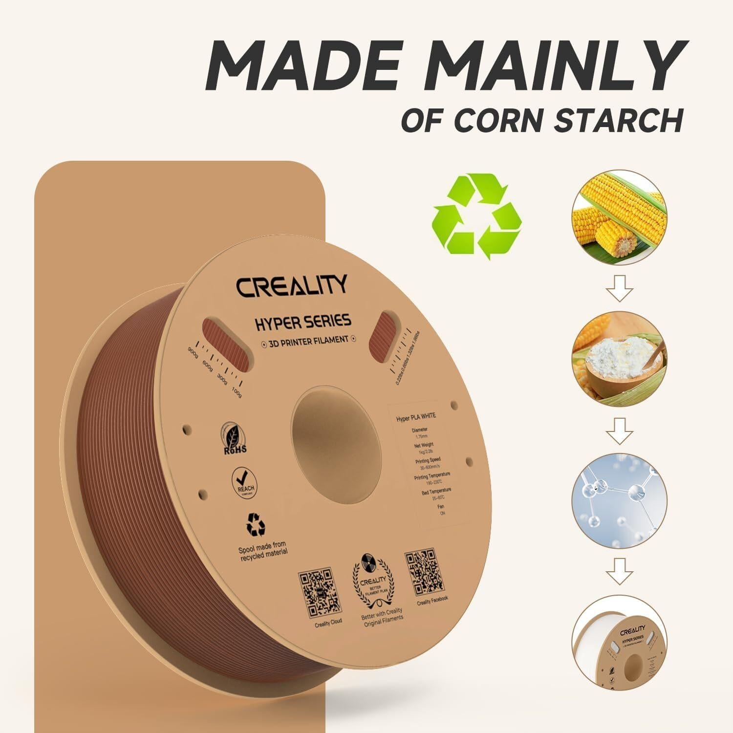 *Hyper Series PLA 3D Printing Filament 1kg** 10× Faster Printing, 30–600mm/s Speed Up Your CreativityThanks to the high fluidity and fast cooling formula, Official Creality Hyper PLA Filament 1.75mm supports up to 600mm/s print speed. High fluidity provides sufficient melting and extrusion, while rapid cooling provides fast shaping for high-speed printing. Eco-friendly Packaging, Reducing Carbon Emissions.* Dimensional Accuracy & ConsistencyOfficial Creality Hyper PLA Filament 1.75mm Uniform Wire Diameter, Stable Extrusion.Based on two-way laser diameter measurement, the filament diameter accuracy is 1.75±0.02mm, which makes it flow out more smoothly.* Higher Toughness & Superior StrengthWith higher tensile strength than ABS and higher toughness than traditional PLA/PLA +/PLA Plus/PLA Pro 3d printing filament, Official Creality Hyper PLA Filament 1.75mm brings better structural bearing capacity to the printed models.* High-quality and Healthy MaterialSourcing raw materials globally and strict quality control deliver excellent printing performance and printing results. Official Creality Hyper PLA Filament 1.75mm are made from eco-friendly materials that are free from harmful toxins and odors, ensuring that you can print with confidence and without any risks to your health. Eco-friendly Packaging, Reducing Carbon Emissions.* Easy to use and Universal compatibilityUnlock your creativity with our Official Creality Hyper PLA Filament 1.75mm! With improved toughness and fluidity, our PLA offers wide temperature and speed ranges to suit all of your innovative needs. Universal compatibility with most of the common 1.75mm 3D printers on the market, such as Creality 3D Printers/Ender 3D Printers,Fit for AnycubicPrinter/Fit for ElegooPrinter/Bambu/Ankermake/Prusa/Flashforge/Monoprice/FLSUN/Artillery/Qidi 3D Printers ETC.* Beginner & Expert FriendlyOfficial Creality Hyper PLA Filament 1.75mm are made with quality and consistency in mind, making it easy for beginner users to get started with basic settings. Seasoned printers can push their designs to the limit without worrying about purity, tolerance or printing issues.*Highlights** 10× Faster Printing, Speed Up Your Creativity* Keep Precision While Keeping Ultra-high Speed* Higher Toughness for Stronger Models* Uniform Wire Diameter, Stable Extrusion* Neat Winding with Smooth Printing* Eco-friendly Packaging, Reducing Carbon Emissions* Better Filament Plan* Highly Compatible with Creality's 3D Printers* Share Model Library on Creality Cloud* Application: Prototyping, Figurines, Machine Parts, Mass Production*Specifications** Product Name: Hyper Series PLA* Wire Diameter: 1.75±0.03mm* Net Weight: 1Kg/2.2lb* Gross Weight: 1.29Kg/2.8lb* Package Size: 210_210_70mm* Printing Temperature: 190–230°C* Hot Bed Temperature: 25℃~60℃* Printing Speed: 30–600mm/s* Fan: 100%* Printing Platform: Carbon Silicon, PEI Platform Board, Textured Paper, PVP Solid Glue* Density: 1.25g/cm³* Tensile Strength (X-Y): 52.991Mpa* Tensile Modulus (X-Y): 1146.064* Elongation at Break: 6.304%* Bending Strength (X-Y): 92.381Mpa* Flexural Modulus: (X-Y): 2490.178Mpa* Charpy Impact Strength (X-Y): 8.8344kJ/m2