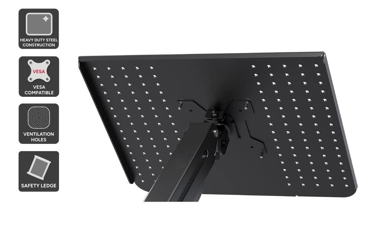 Elevate your workstation with the Kogan Laptop Holder featuring a VESA mount for 10” – 17” laptops, offering stability, ventilation, and a sleek design for a secure and efficient setup that maximises airflow and minimises overheating.* Supports 10” – 17” laptops weighing up to 10kg* Heavy-duty steel construction ensures a stable and secure setup* Venting holes promote better airflow, preventing overheating* Safety ledge ensures your laptop stays securely in place* Elegant and sleek matte black powder coating finish* Secure this to one of our Monitor Mounts* Improved ergonomicsElevating your laptop to eye level reduces strain on the neck and shoulders, promoting better posture and reducing discomfort during extended use. Furthermore, lifting the laptop off the desk creates extra space for other peripherals or tasks.*Stable and secure setup*The heavy-duty steel construction and safety ledge provide stable and secure support for your laptop, ensuring a reliable workspace setup that you can trust. Say goodbye to wobbly or unstable arrangements and hello to a dependable platform for improved productivity.*Prevents overheating*Keep your laptop running cool and efficiently with venting holes that promote better airflow, preventing overheating and potential performance issues. Ensure your laptop maintains an optimal operating temperature, and reduce the risk of laptop damage due to excessive heat.*Elegant design for a modern workspace*The sleek matte black powder coating finish not only adds an elegant touch but also blends seamlessly with modern office aesthetics, elevating the overall look of your workspace. A clean workspace fuels your success!*Technical Specifications*Dimensions* Dimensions: 35 × 28cm* VESA Wall Mount Pattern: 100 × 100mmFeatures* Colour: BlackGeneral* Compatible Laptop Size: 10"-17"* Material: Steel* Related Product: Laptop Holder* Weight Capacity: 10kgMaterials* Finish: Powder CoatingWarranty* Manufacturer Warranty: 1 Year