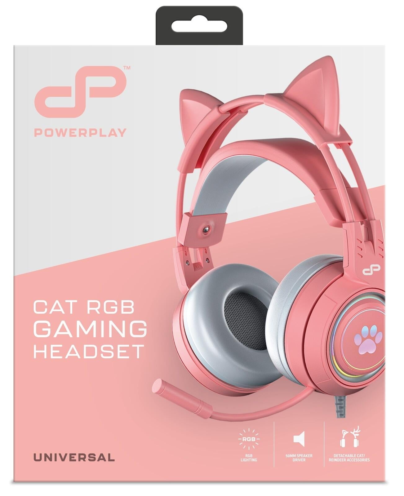 The PowerPlay Cat RGB Gaming Headset combines charm with a featherweight design for prolonged comfort. It features a powerful 50mm speaker driver and a 3.5mm plug, ensuring compatibility with various devices. Enjoy dynamic RGB lighting and two sets of detachable accessories for a fun look, or go accesory-free for that classic style!Features:* Dynamic RGB lighting* 50mm speaker driver provides increased audio quality* Includes detachable cat and reindeer accessories* Lightweight design ensures maximum comfort